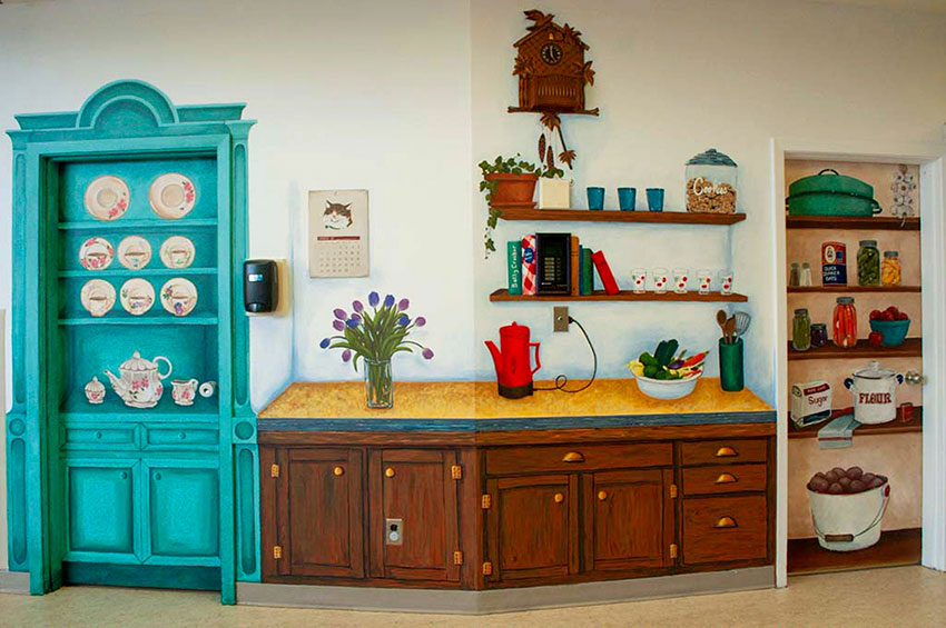 Skinner Place is a memory care neighbourhood at Yorkton & District Nursing Home. To transform Skinner Place into a more inviting, familiar home for residents, the Recreation department collaborated with Yorkton Arts Council to commission murals to disguise our exit doors and to add warmth and brightness to our dining room. Residents actively participated in co-designing and were engaged in making changes along the way. The residents chose names for the pets that are part of the murals. Getting it right was very important for our Residents and after declaring that Sanchez (the cat) was not visible enough, the artist worked with Residents for a re-design.