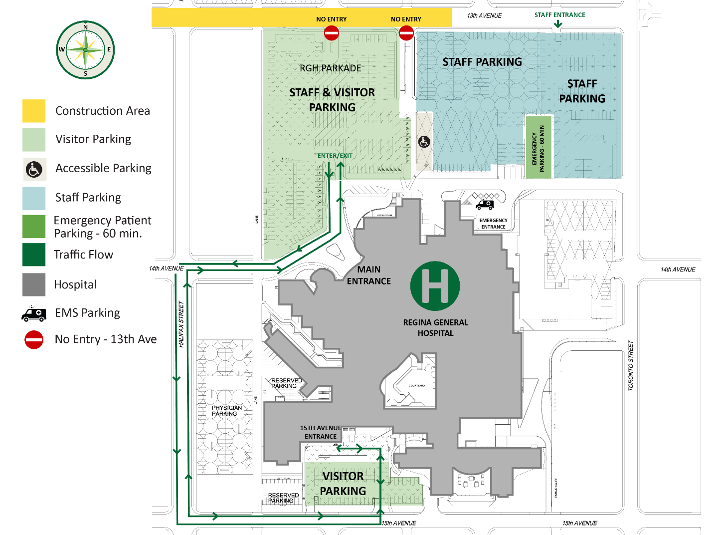 The RGH parkade will be available for use throughout all phases of construction; however, the only way to access the parking garage during the second phase will be via 14th Avenue. Patients and visitors should consider using the 15th Avenue entrance for drop-offs and pick-ups to avoid congestion at the 14th Avenue main entrance, whenever possible.