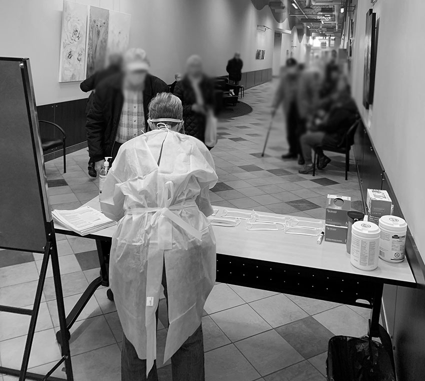 By the time immunization day arrived, all the pieces were in place. Twelve physicians, one resident and one casual nurse gave the injections. Two public health nurses and the clinic pharmacist reconstituted (i.e. diluted) the vaccine concentrate. Beaurivage oversaw administrative functions and drew up each dose. Chard resolved issues on the fly, co-ordinating patient and vaccine flow, overseeing the needs of patients and staff and liaising with public health. An administrative co-ordinator and seven support staff, along with four medical students, aided with patient screening and flow, room cleaning and other duties.