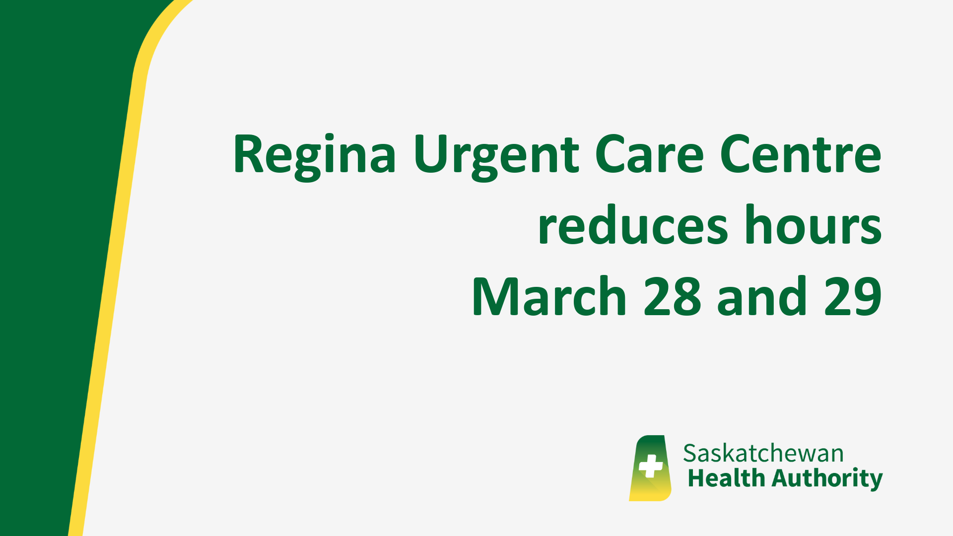 The Regina Urgent Care Centre will return to its regular hours of operation of 8:00 a.m. to 9:30 p.m. on Monday, March 30. These service adjustments are due to physician availability and to proactively ensure the availability of services for our patients.