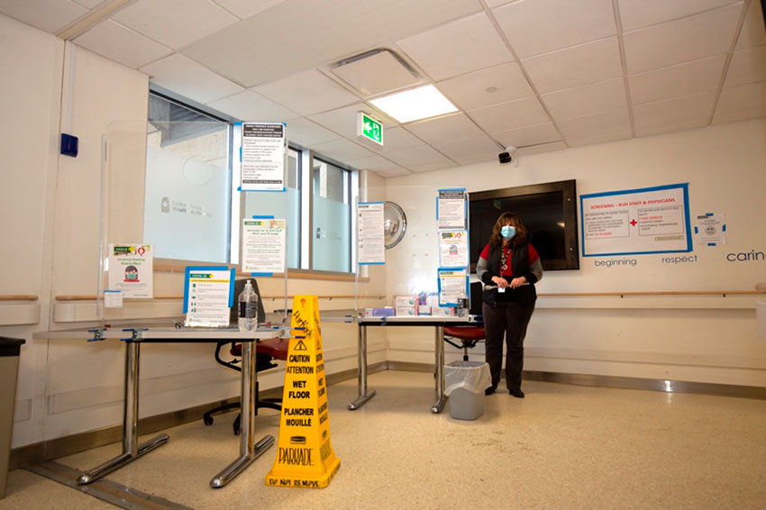 At Royal University Hospital (RUH), located in Saskatoon, the first stop in the screening process is an SHA Protective Services Officer. Behind the officer are two screening stations. At the first station, your temperature will be checked by a thermal camera, you will be asked to exchange your current mask for a clean medical grade mask and sanitize your hands.